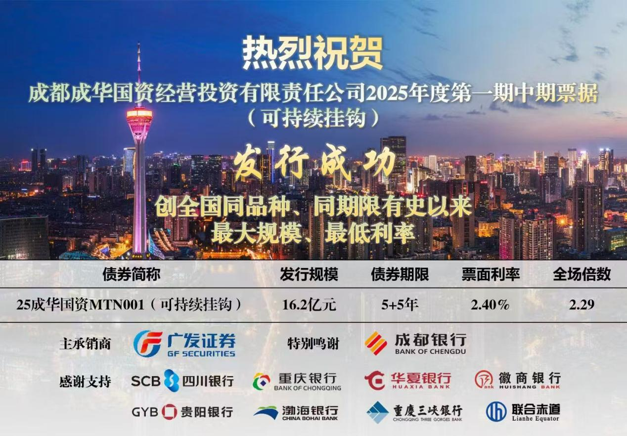 近期,由万商天勤成都办公室合伙人郭崇甫律师团队主办,团队李怡潺律师、吕薇潇律师具体经办的成都成华国资经营投资有限责任公司2025年度第一期中期票据(可持续挂钩)成功发行。